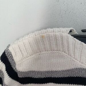 Black white and silver striped. Folded sleeves with button details. High neck. Knit.