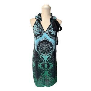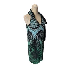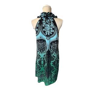 Karen Kane 100% Silk Paisley Patterned Blue & Green Ombre Cocktail Dress. Very boho chic! Features halter neck style with ruffle detailing. Decorative sash tie on neck. Lovely ombre colors that go from turquoise blue into emerald green underneath a black paisley and floral design. Pull on styling. Unlined. 100% silk. Dry clean only. Measurements in pictures.