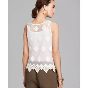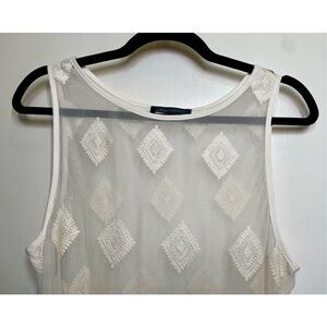 Embroidered Mesh Sheer Tank Top size L. Diamond Boho embroidery and sheer feminine fabric fuse together on this summer perfect tank from Karen Kane. This does not have liner it is completely sheer would wear with bralette or tank under.