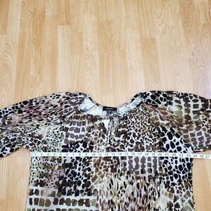 Billowy blouson sleeves and a camouflage animal print lend safari charm to Karen Kane's 3/4-sleeve peasant top. It also features a stylish tie-neck.