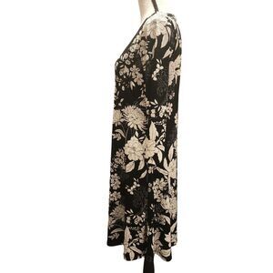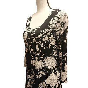 A classic black and white floral A-Line dress that is as flattering as it is comfortable! Pullover, scoop neck, 3/4 sleeves.
