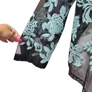 Floral blue rose embroydered sheer black mesh long sleeve blouse with lace trim.