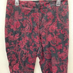 Love these fun black corduroy pants featuring a red floral and paisley print. They measure 16 inches at the waist laying flat and have a 32 inch inseam.
