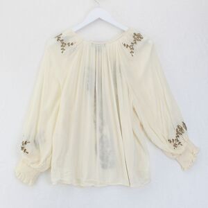Achieve boho perfection in this gauzy blouse styled with a tassel-tie neck and enchanting embroidery.