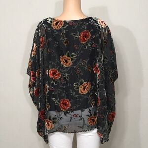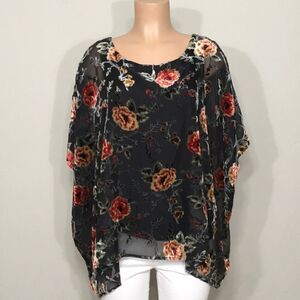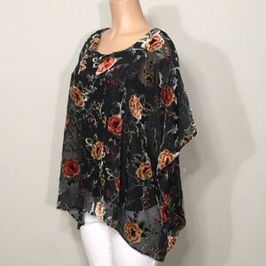 Beautiful black scarf top with velvet floral design. Stretch tank under scarf. This top is striking and high quality. Scarf is sheer and tank is black under. Love this!