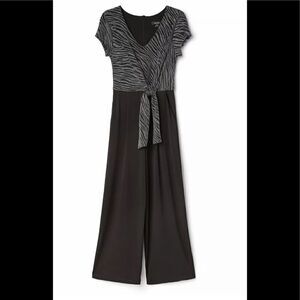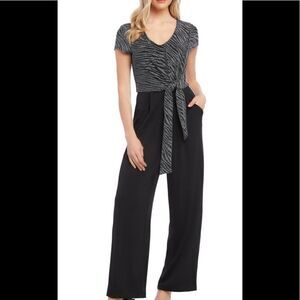 Shimmering metallic threads in a zebra pattern shapes this ultra-flattering jumpsuit detailed with a fitted waist accentuated with a stylish tie-front. It features sleek side pockets and a polished wide-leg.