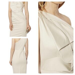 Karen Millen stone one shoulder fitted pencil dress gathered shoulder size 2 - gathered shoulder detail - structured silhouette - fitted - asymmetric neckline - knee length - medium weight - hidden side zip - pleated bodice - small spot on side - color of dress is light stone gray- stock pic is more vanilla color - 96% cotton 4% elastane - approximate measurements taken laying flat: * length- 37” * bust - 14” * waist - 12” Tags: one shoulder, mini dress, off white, gathered, cocktail