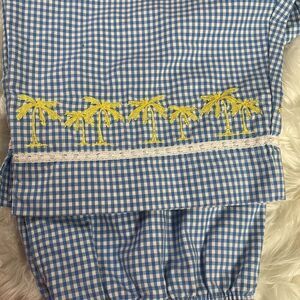 Blue and White Checkered Pattern with row of embroidered palm trees in bottom of each leg with ribbon trim