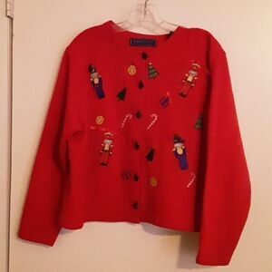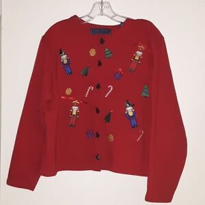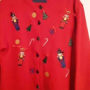 Red Christmas sweater. Very merry and very bright. Super cute Christmas ornament patches. Christmas trees button down cardigan. Gently used wear signs. Pre-owned in great condition.
