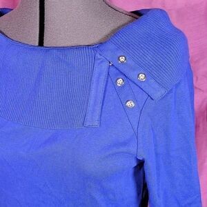 This wide neck knit top by Karen Scott has ribbed shawl collar with shiny button embellishments at the left shoulder. Content: 100% cotton. Care: machine wash, tumble dry.