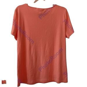 Short sleeve tee with gold accents at front neckline. It’s a peachy-salmon color. Size Large. 18” X 25”. Great condition.