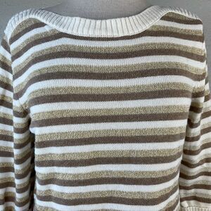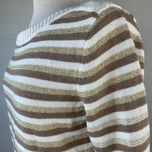 Super cute sweater by Karen Scott featuring a gold metallic striped design and button up half sleeves. It measures 19 inches armpit to armpit and 24 inches from shoulder to hem.