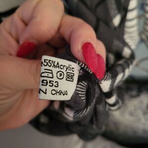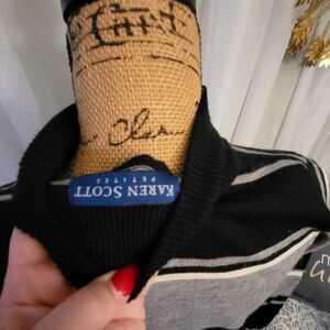 Karen Scott turtleneck sweater, size petite small, black, grey, and white horizontal stripes. 30% Merino Wool, 70% acrylic