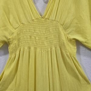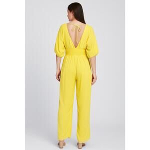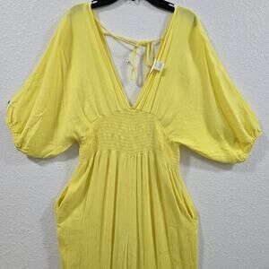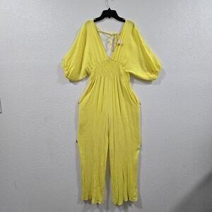 The Karen-T Design Yellow Wide Leg Jumpsuit in size L is a stylish and versatile piece perfect for various occasions. Made from rayon fabric, this boho-inspired jumpsuit features a flattering V-neckline and puff sleeves, with a relaxed fit for all-day comfort. Ideal for travel, parties, casual outings, or even workwear, this jumpsuit adds a pop of color to your wardrobe with its vibrant yellow hue. The wide-leg design and smocked details give it a trendy and fashionable look, making it a must-have for the summer and spring seasons.