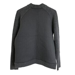 This listing is for a Kari Traa Faere Insulated Bomber Puffer Jacket. Grey. Knit sweater style sleeves. Full zip down the front. Zip pockets. Wool/Polyamide Blend / Poly fil.