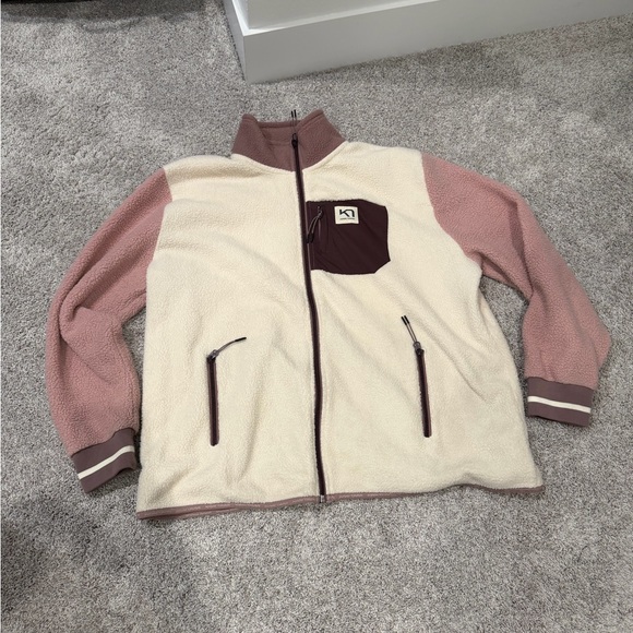 Soft sherpa jacket with cream interior and mauve outer. Zip front with cozy high collar. Subtle logo tag at neckline. Casual, warm layer for everyday wear.