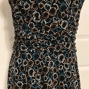 Karin Stevens black patterned sleeveless dress in size 8. Black background with teal, white and tan pattern. Stretch fabric is 95% polyester and 5% spandex. Crossover v-neck with ruched middle both front and back. Excellent like new condition. Please see photos for approximate measurements laying flat and details. From smoke free and pet free home.