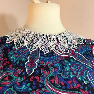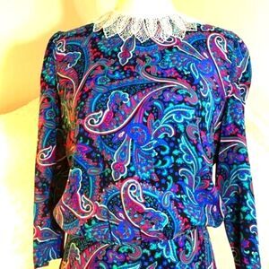 Late 80's-Early 90's Vintage high circle neckline pasley multi-colored print dress. Long sleeves.Half zipper & Half Button back closure detail. Pre-owned in great condition. Please refer to pictures for best description and condition verification.