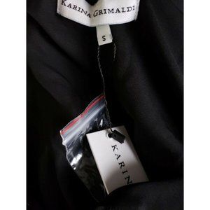 Elegant Karina Grimaldi top with sheer black fabric. Features gold stripes and button details. Perfect for a chic look.