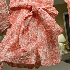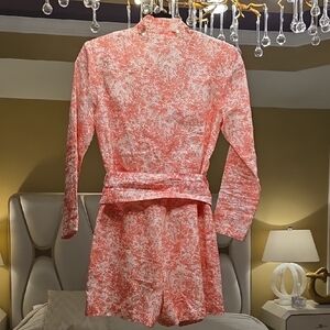 Step into style with the Karina Grimaldi Romper, featuring a delightful pink and white floral pattern. This elegant piece combines comfort and sophistication, perfect for any occasion. Its lightweight fabric and wrap-style design ensure a flattering fit. 100% Cotton and 100% Linen lining. Not stretchy, please see measurements on pictures.