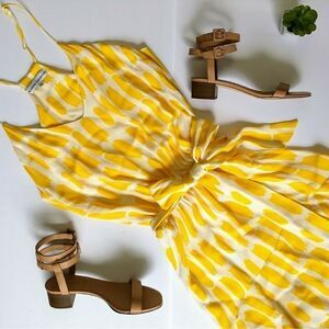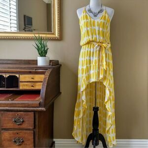 features a lemon yellow brushstroke print on white with a dramatic high low hem, slim straps with a v-neck, ruffle detail at the hem, and a wide self tie sash at the elastic waist.