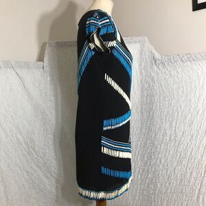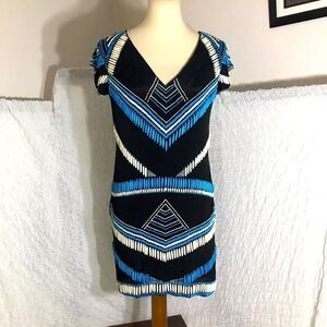 Beautiful boho style mini dress. Short sleeve black mini dress with blue and white beaded details. 100% Silk with 100% viscose lining.Pre-owned in good condition. Please refer to pictures for best description and condition verification.