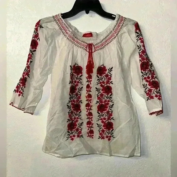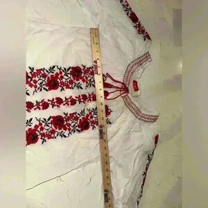Karina White Top With Red Floral Embroidery & Tassels Size Small