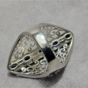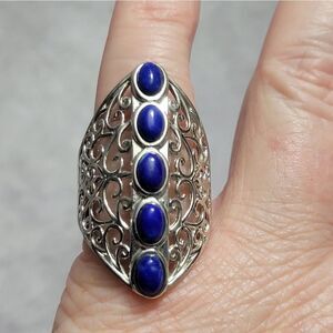 Flourishing with intricate filigree, this five-stone Lapis Lazuli ring from the Karis Collection is sure to add an eye-catching appeal to your appearance. Lapis Lazuli Openwork Elongated ring in Platinum bond (Size 8) 3.25 ctw