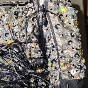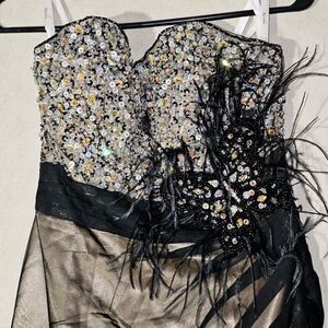 Make a bold and glamorous statement with the Karishma Glam Butterfly Formal Mini Dress. This stunning dress features a strapless design with a mesh overlay adorned with delicate feathers for a touch of elegance. The top is embellished with shimmering rhinestones that catch the light with every move, ensuring all eyes will be on you. Perfect for a special occasion or a night out, this dress is sure to make you feel like a true fashion queen.