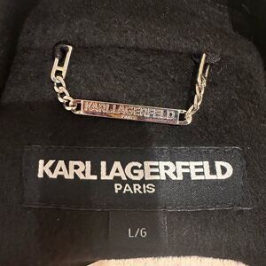 Chic black wool pea coat with double-breasted design. Features signature Karl Lagerfeld detailing. Ideal for a sophisticated look.