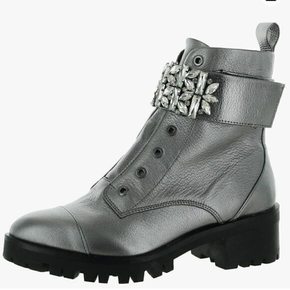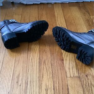 Karl Lagerfeld 6.5, leather boots, zipper closure, rhinestones embellished, combat slug sole, metal eyelet, Velcro strap, memory foam foot bed.
