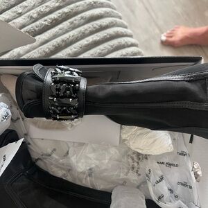 Chic black mesh heels by Karl Lagerfeld. Stylish and versatile.