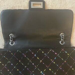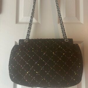 This sophisticated shoulder bag by Karl Lagerfeld features a timeless black quilted design, complemented by a sleek silver chain strap. Gently used in good condition with minor wear shown in last pic. Clean interior. Size Width 25” Height 8”