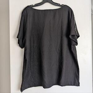 Silver grommet embellishments on t sleeves. Blouse has a faint texture design on the black material.