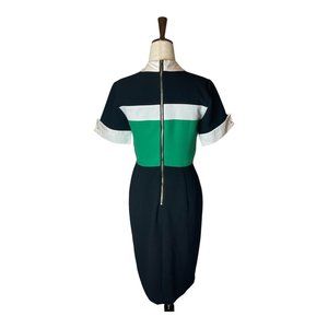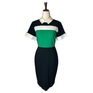 Chic mini dress with contrasting green and black design. Features white collar and sleeve accents. Perfect for stylish outings.