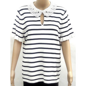 Karl Lagerfeld rayon black and white striped short sleeve knit top with cotton lace collar and key hole pearl button. Size L. Brand new with tags.