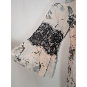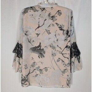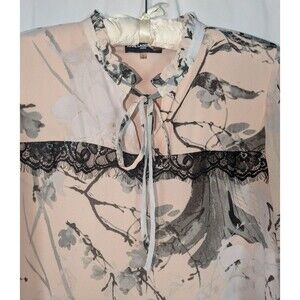 Karl Lagerfeld Blouse M Women's Pink Floral Lace Trim Bell Sleeves Tie Neck
