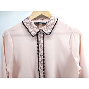 Karl Lagerfeld Blouse Womens Medium Pink Peach Button Cuff Collar Lace Trim