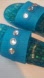 Stylish blue slide sandals. Features silver accents. Perfect for casual wear.