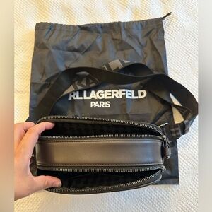 Chic Karl Lagerfeld camera crossbody bag.Embossed design with adjustable strap. Ideal for modern style.