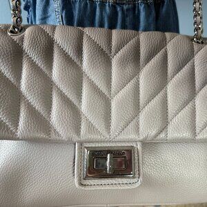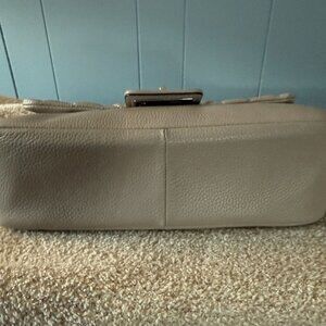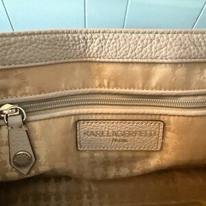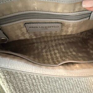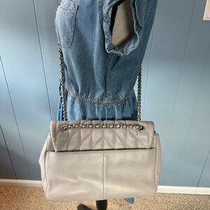 Karl Lagerfeld Chain Shoulder/Crossbody Bag with lock closure. Silver and leather chain with silver hardware. Back snap pocket. Interior 2 front slip pockets and 1 back zippered pocket. Quilted leather exterior. Used only a few times. Mint condition. Beautiful leather - color is an elephant gray. Can be worn as a shoulder or crossbody bag. Smoke free home.