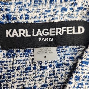 The product is a Karl Lagerfeld drop-waisted tweed sleeveless dress in a blue and white color combination, size 8. The dress is designed for various occasions such as formal events, parties, or workwear, and features a fit and flare style with a knee-length hemline. The drop waist detail adds a unique touch, making it a stylish and versatile choice for women looking to make a colorful statement. Made from tweed fabric, this dress offers a classic and sophisticated look with a modern twist.