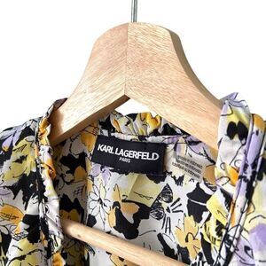 - Brighten your wardrobe with this chic and playful Karl Lagerfeld creation—a gorgeous floral-print top in bold yellow and black, finished with elegant ruffle details.