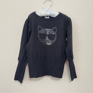 Stylish black sweater featuring a sequin cat design. Perfect for adding a playful touch to your outfit.