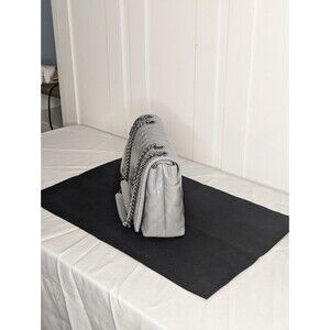 This Karl Lagerfeld Paris Lafayette bag is a versatile piece that can be worn as a crossbody or as a shoulder bag. The bag is made of high-quality leather and features a quilted finish, silver hardware, and a silver chain strap. It has a large size with a width of 13 inches, a height of 9 inches, and a depth of 3 inches. The bag has a solid pattern and comes in a smoke exterior color with polyester lining material.