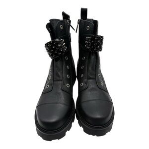 New without box. Karl Lagerfeld Paris “Maeva” Lug-Sole Combat Booties combine edgy attitude with luxe sophistication. Crafted from leather and man-made materials, these boots feature chunky lug soles, crystal-embellished buckle straps, and metal grommet details for a statement finish. Zip closure at inner ankle for easy wear.