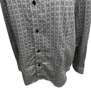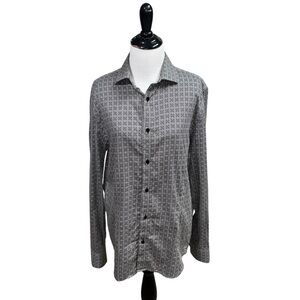 Karl Lagerfeld Men's Designer Button Down Shirt in Size Medium. The fabric is a Cotton Blend, lightweight. Long Sleeves with a black and white geometrical Print. There is some very very minor discoloration on the collar. Its shown in a close up in the photos. Its only visible in certain lights. Please be aware of this before purchasing. Otherwise in great Condition.