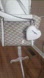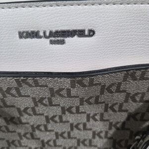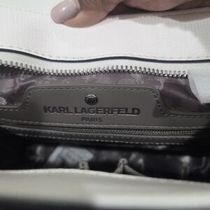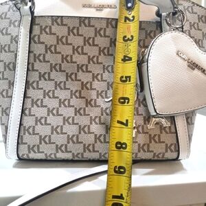 Chic satchel with signature monogram design. Features beige and white tones. Includes heart-shaped charm.