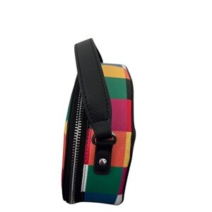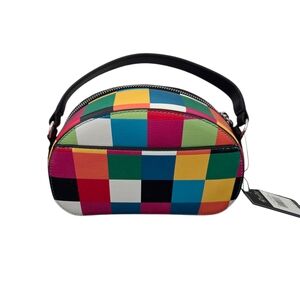Vibrant crossbody bag with playful graphic design. Features bold color blocks and sleek black strap. Perfect for adding flair to any outfit.