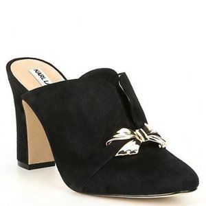 Karl Lagerfeld Paris Norah Black Block-Heeled Suede Bow Mules, Stay on-trend in these chic mules, designed with a goldtone bow embellishment on the Leather upper, Square toe, Slip-on-style with open back design, Padded insole, Heel height just shy of 4", only tried on, flaw on right shoe -see last picture, Euro size 37.5 B, tag on bottom, no box